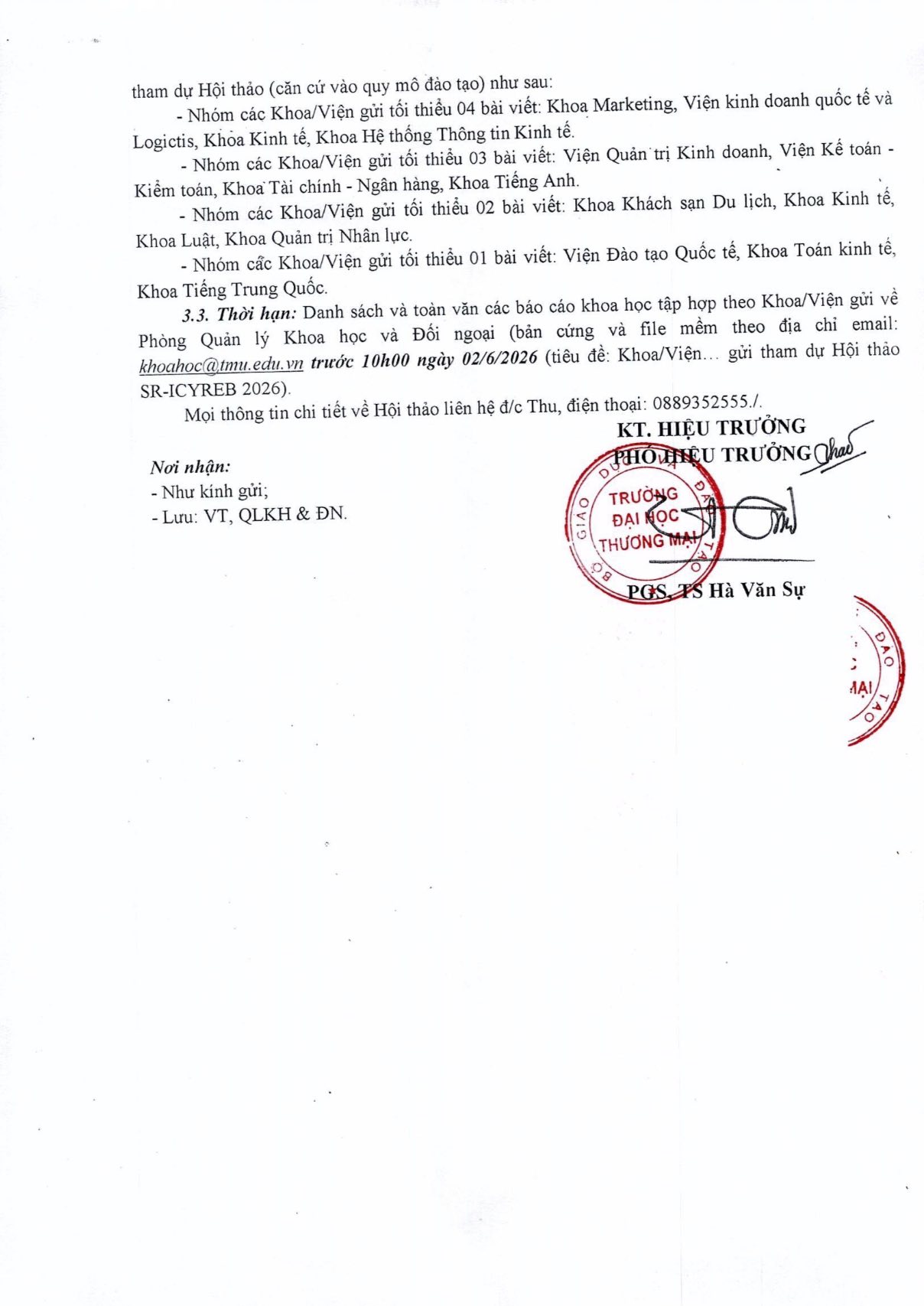 - Thời hạn: Các Khoa tổng hợp toàn văn bài viết (file mềm), đồng thời lập danh sách (file mềm và bản cứng) gửi về Phòng Quản lý Khoa học và Đối ngoại qua email: khoahoc@tmu.edu.vn trước 10h00 ngày 02/06/2026.